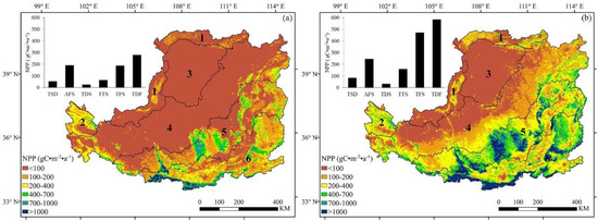 NPP distribution in (a) 2001 and (b) 2020 on the Loess plateau. The numbers on the pixels represent six sub-regions on the LP: (1) temperate steppe desert (TSD), (2) alpine forest–steppe (AFS), (3) temperate desert–steppe (TDS), (4) temperate typical steppe (TTS), (5) temperate forest–steppe (TFS), (6) temperate deciduous forest (TDF). Bar charts show the average NPP in six sub-regions in 2001 and 2020.