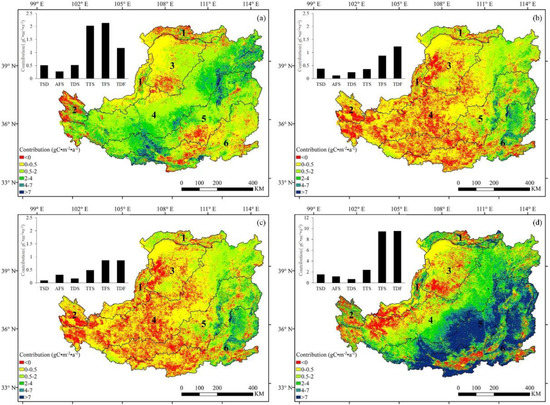 Contribution of each driving factor to interannual variations in NPP: (a) precipitation; (b) temperature; (c) radiation; (d) human land use. Red pixels represented weakly negative contributions to NPP increases. Yellow pixels represented faint positive contributions to NPP increases. Green pixels represented obvious positive contributions to NPP increases. The numbers on the pixels represent six sub-regions on the LP: (1) Temperate steppe desert (TSD), (2) alpine forest–steppe (AFS), (3) temperate desert–steppe (TDS), (4) temperate typical steppe (TTS), (5) temperate forest–steppe (TFS), (6) temperate deciduous forest (TDF).