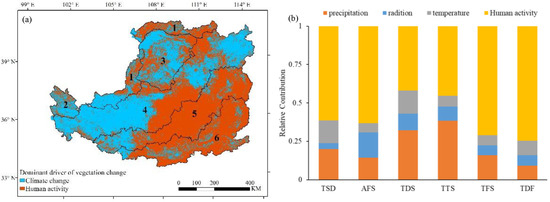 (a) Spatial pattern of dominant driver of variations of NPP on the LP. The numbers on the pixels represent six sub-regions on the LP: (1) Temperate steppe desert (TSD), (2) alpine forest–steppe (AFS), (3) temperate desert–steppe (TDS), (4) temperate typical steppe (TTS), (5) temperate forest–steppe (TFS), (6) temperate deciduous forest (TDF). (b) Relative contribution of climate factors and human activity to variations of NPP in sub-regions on the LP.