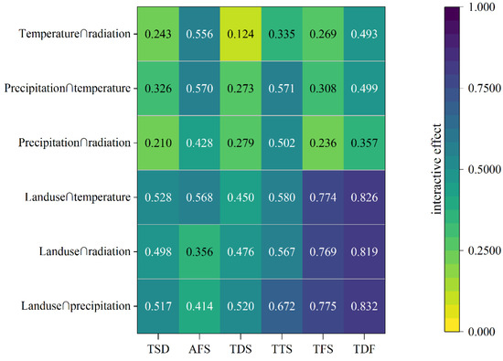 Vegetation growth was determined by the combined effects of driving factors. Therefore, analysing these interactive effects has been an important part of deepening our understanding of the attribution of vegetation variations. Based on Geo-detector analysis, interactive effects were calculated to characterize the weights and interactive effects of different driving factors on vegetation variations. In Figure 7, all of the effects of the interaction between land use and climate factors exceeded 0.5 in the TTS, TFS, and TDF sub-regions, which indicates that land use was a core driver of vegetation growth in the southeastern LP. In the northwestern regions, the interactive effects of land use∩climate factors were relatively weak, which meant that the impacts of land use were weaker, and climate factors had a higher impact weight than that in the southeastern LP. Furthermore, the interaction between land use and precipitation had the highest ability to explain changes in NPP in the TDS, TTS, TFS, and TDF sub-regions, which meant land use and precipitation were the two most important factors for vegetation variation in most areas of the LP. In general, vegetation was mainly affected by land use in the southeastern LP, while the influence weights of climatic factors increased in the northwestern part.