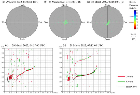 Figure 3 is the relevant case for detection frequency selection and optimal height range restriction. Figure 3a shows an invalid drift measurement without selecting reasonable detection frequencies; Figure 3b shows an invalid drift measurement with reasonable detection frequencies but no reasonable optimal height range. Its false optimal height range is 457–662 km, and thus the skymap reflects the mixed distribution of primary and secondary reflection points; Figure 3c describes the drift measurement with the reasonable detection frequencies and the reasonable optimal height range. Its optimal height range is 325–342 km, and thus the skymap reflects the distribution of primary reflection points; Figure 3d is an ionogram comprising the black trace curve of automatic calibration obtained 3 min before drift measurement (Figure 3a), and the wrong calibration result leads wrong parameters being transmitted to drift detection; Figure 3e is an ionogram whose detection and calibration results are obtained 3 min before drift measurement (Figure 3b,c). Several teams worldwide have been involved in the ionogram automatic calibration process for a long time [25,26,27,28].