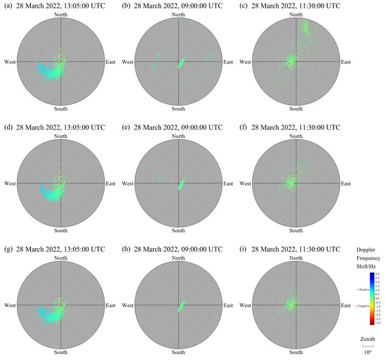 Reflection points should be concentrated around the center of the skymap in which the ionospheric drift above the receiving antenna is to be detected. In accordance with the distribution characteristics of the Doppler spectrum, the dominantly concentrated reflection points (reflection cluster) should be the bipolar pattern comprising zero, positive and negative Doppler frequency shifts and zero Doppler frequency shifts close to the skymap’s center, and the ideal situation is to only retain the bipolar reflection cluster (Figure 6a). Actually, the reflection cluster containing other types of reflection points also exists (Figure 6b,c). The concentrated monopolar reflection cluster is mainly generated by disturbed geomagnetic conditions [29]. Scattered, irregularly distributed and time invariant reflection points are caused by strong mutation interference generated by electromagnetic interference.