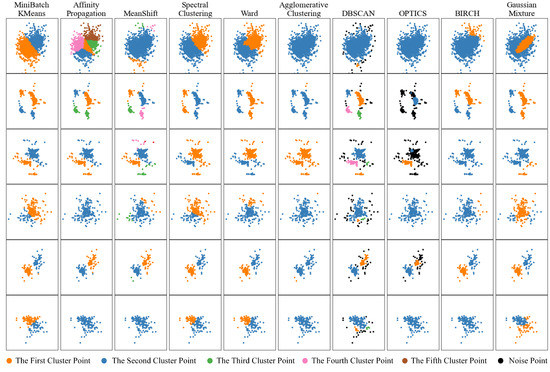 To improve this situation, ten clustering methods were used to cluster six representative skymaps. The clustering results in Figure 7 reveal that MeanShift, DBSCAN and OPTICS algorithms cluster better. These three methods are suitable for clustering the effective reflection points with a high-density distribution (concentrated distribution), as they are density-based clustering methods. The MeanShift algorithm finds and adjusts the centroid in accordance with the sample density in the dataset, whose location is the mean of the samples within its neighborhood [31]. DBSCAN and OPTICS algorithms look for high-density sample areas in the dataset and expand the surrounding areas into clusters. They differ in that the maximum distance between two samples in DBSCAN is a fixed value and the maximum distance between two samples in OPTICS is a value range [32,33,34]. These three clustering methods conduct clustering analysis on the basis of different criteria, and each has its own advantages and disadvantages. MeanShift and DBSCAN algorithms can more easily separate multiple clusters, but some scattered samples could be lost when there is only a single cluster; on the contrary, OPTICS makes it easier to retain all samples of a single cluster, while being able to roughly separate multiple clusters. If three clustering methods are combined for coarse clustering analysis, extracting the bipolar reflection cluster including selected reflection points can be easier and more effective. The following is the data processing process: