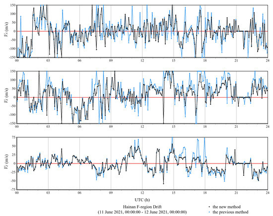 The first experiment only adopted drift echo data of DPS4D system which were measured from 11 June 2021 to 23 June 2021. The automatic drift-measurement-data-processing method proposed in this paper (the new method) was used to process drift echo data. Then, the obtained drift velocities were compared with the drift velocities which had been calculated by the previous method encapsulated inside DPS4D system. The comparison results present that they have high similarity, and the newly obtained drift velocities change more gently and have smaller standard deviations. These further indicate that unreliable reflection points are eliminated or reduced, rapid fluctuations of drift velocities are retarded appropriately and the quality of drift measurements is improved. Figure 8 shows a comparison of drift velocities from 11 June 2021 to 12 June 2021. This experiment proves the feasibility of the drift data processing method proposed in this paper and illustrates that this new method is suitable for the DPS4D system.