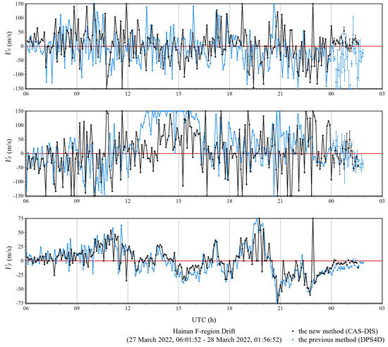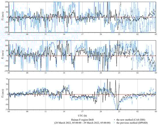 The similarity was also sustained by comparing drift measurement results of CAS-DIS and DPS4D from 28 March 2022 to 29 March 2022 (Figure 11). On 28 March 2022, 11:26:52–14:17:02, reflection points from primary and secondary echoes were used for fitting the drift velocity. On account of the reflection points from the secondary echoes distributed in the north–south direction, these drift velocities are distortions. On 28 March 2022, 21:02:02–22:16:52, there was a partial overlap between the E and F layers, and the strong E layer echoes blocked all or part of the F layer echoes. From 28 March 2022, 23:00:00 to 29 March 2022, 05:00:00, the method owned by DPS4D extracted the unreliable reflection points, including the reliable reflection cluster and time invariant reflection clusters. The standard deviations of these drift velocities are larger than the standard deviations of the drift velocities obtained by the new method owned by the CAS-DIS system. It can be demonstrated that the new method is also applicable to CAS-DIS with another drift detection mode, and this further demonstrates the wide applicability of the new method. Combined with the results of the second experiment and the third experiment, the diurnal variation of drift velocities can be observed.
