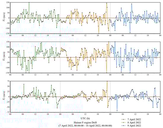 Since drift velocities are affected by the solar activities, the diurnal variation law of drift velocities exists. In the last experiment, in order to better observe whether drift velocities had a diurnal variation law, we statistically analyzed the drift velocities processed by CAS-DIS which had been obtained in the third experiment. Figure 12 shows the statistical results of drift velocities from 7 April 2022 to 10 April 2022, which reveals the plain diurnal variation.