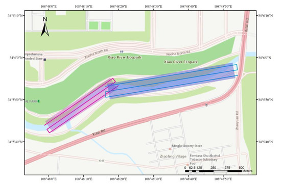 The study area was selected as the Xiao River Ecological Park in Xi’an, Shaanxi Province, China. The experiment was conducted on 28 March and 11 April 2022. The weather in the experiment was sunny and wind was Level 2. This experiment covers a river length of 1.1 km. Sampling points are set at intervals of about 50 m. There are 40 groups of sampling points in total. However, four samples are corrupted by the shadow of trees and abandoned. The final 36 samples are divided into 28 samples for training model and 8 samples for testing. The sampling points and experimental areas are shown in Figure 1 and Figure 2. Figure 2 is the COD inversion map with the actual sampling sites on 11 April.