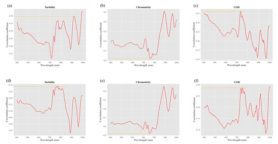 The band correlation curves of the water quality parameters (Turbidity, Chromaticity, COD). (a–c) are original band correlation curves of the water quality parameters. (d–f) are band correlation curves after the process of noisy instance selection.