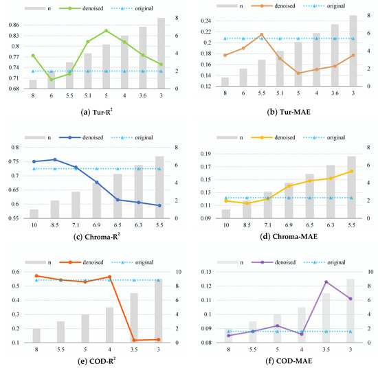 Figure 5e,f represents the R2 and MAE results of the model on the test set in the COD inversion experiment, respectively. It can be seen from the figure that when n is less than four, the performance of the model decreases slowly, and when n is greater than four, the performance of the model on the test set degrades severely. We suppose that this is because the outliers in the COD data carry important feature information rather than polluted noise information. Model performance drops when outliers that carry important information are gradually removed.