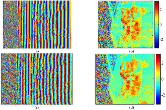To examine the relationship between the forest and the scattering phase, the interferometric phase images of different sub-views of HV channel images were obtained from the complex PolInCCs. Before this operation, one of the most significant steps was to calibrate the attitude error, mainly caused by the roll angle, in terms of the inertial navigation system (INS). Without this procedure, the interferometric phase fringe would be severely bent, although the ground in the forest area is flat, thus resulting in great errors in the final forest height estimation. After the attitude calibration, the interferometric phase fringe of the sub-views images was nearly straight along the azimuth in the images in terms of the flat ground context. Figure 8 shows the phase fringes of different sub-views of the HV channel, and the phase results of different sub-views obtained after removing the flatting effect. Based on the phase fringe maps, we can see that, on the left side of the map, the phase was almost noise. Because the scene on the left side was the yellow river, the decorrelation effect was very remarkable in the torrents.