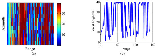 Forest height estimation results using measured X-band data, obtained using different methods. (a,b) are the results of NEPhVpd, (c,d) are the results of NEPcVpd, (e,f) are the results of NEPcVe, (g,h) are the results of EPcVpd, and (i,j) are the results of EPcVe, respectively. (a,c,e,g,i) are the two-dimensional height estimation results and (b,d,f,h,j) are the profiles of height along the range in the same azimuth bins.