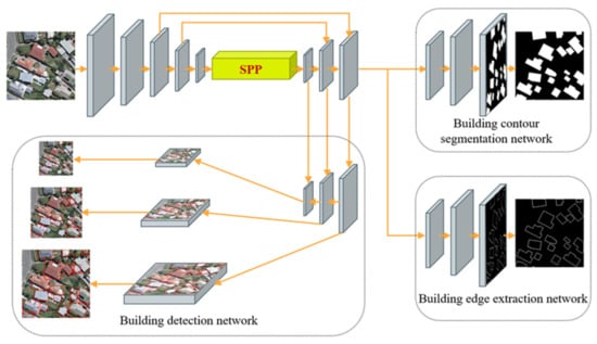 As shown in Figure 3, the building extraction module based on multitask learning consists of three networks, namely, a building detection network, a footprint segmentation network, and an edge extraction network, all of which run in parallel during training.