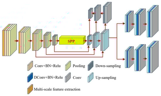 (1) A multiscale feature extraction and fusion network. A spatial pyramid pooling (SPP) [40] module and a FPN module are integrated into the encoder portion of the MultiBuildNet framework. The framework can generate and fuse features at different scales and different semantic levels by performing multiscale feature extraction in the spatial context to improve the robustness of feature extraction.