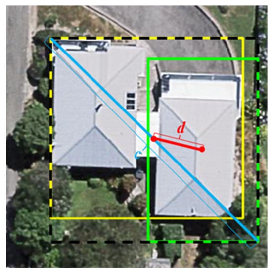 The focal loss Lfl is adopted for the classification loss and objective loss, which is used to control the weights of positive and negative samples and of difficult and easy samples. Two penalty factors are introduced to reduce the weights of easy samples so that the model can focus more on difficult samples during the training process, thus solving the issue of unbalanced sample categories. The classification loss is used to penalize problems in the binary classification of building/nonbuilding samples, while the objective loss is used to penalize confidence in building instance predictions. The complete intersection over union loss function LCIoU is adopted for the bounding box loss. It is used to penalize the predicted frame confidence and takes into account three important geometric factors, namely, the overlap area between the predicted and real frames, the center point distance, and the aspect ratio, as shown in Figure 4. In this figure, the solid yellow rectangle represents the real frame for building detection, the solid green rectangle represents the predicted frame for building detection, the dotted black rectangle indicates the minimum closed area that can cover both the predicted and real frames, c is the diagonal length of the minimum closed area covering both the predicted and real frames, and d is the distance between the center points of the predicted and real frames. The focal loss and the complete intersection over union loss are calculated as shown in Equations (3) and (4), respectively: