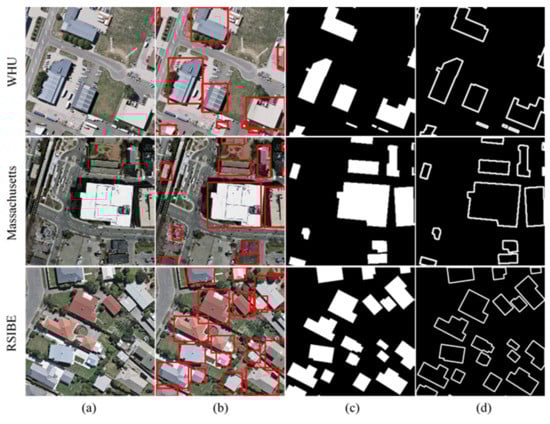 Examples of the experimental datasets. (a) Images. (b) Building detection labels. (c) Building footprint segmentation labels. (d) Building edge extraction labels.