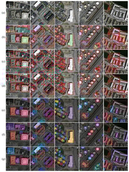 Results of building detection on the RSIBE dataset. (a) Images. (b) Labels. (c) YOLOv4. (d) Faster R-CNN. (e) YOLACT. (f) Mask R-CNN. (g) MultiBuildNet.