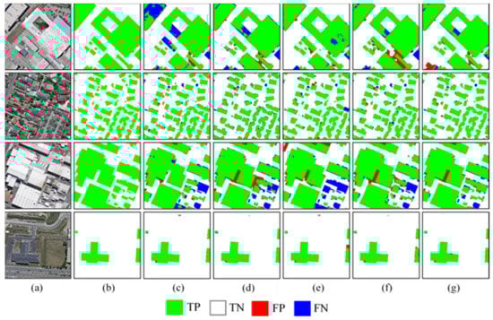 Results of building footprint segmentation on the Massachusetts dataset. (a) Images. (b) Labels. (c) U-Net. (d) PSPNet. (e) HRNet. (f) DeepLabV3+. (g) MultiBuildNet.