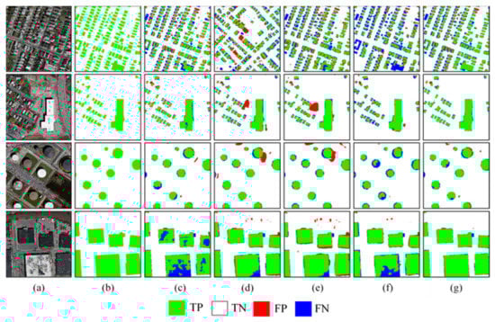 where TP represents the number of correctly predicted building pixels, TN represents the number of correctly predicted background pixels, FP represents the number of background pixels incorrectly predicted to be building pixels, and FN represents the number of building pixels incorrectly predicted to be background pixels.