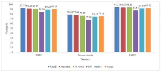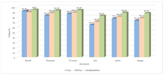 Table 6, Table 7 and Table 8 compare the results for the building footprint segmentation accuracy of the above methods. As indicated in the tables, the MultiBuildNet framework is superior to the other deep learning models on the RSIBE dataset in terms of all indicators, with an IoU of 93.54%, a Precision of 95.23%, and a Recall of 96.34%, presenting significant performance advantages.