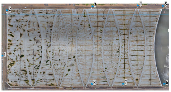 Metashape Professional by Agisoft [18] was then used for post-processing of the images taken from the scan (photogrammetry) to generate a digital elevation model (DEM). The computer used for the post-processing has 2 processors (Intel® Xeon® CPU E5-2630 0@2.3GHz) with 6 cores and 128 GB of memory. Agisoft Metashape adopts computer vision algorithms as described in [19,20,21] which allow the user to set the quality of aligning images, building dense clouds, mesh and capable of generating a digital elevation model (DEM). All the metadata (e.g., GPS location and camera setting) of the images were first imported to Agisoft Metashape Professional for alignment purposes. Metashape allows the user to define the quality of aligning images, and building dense clouds and mesh. All settings were set to high when post-processing the images acquired from all flights. A total of 8 ground control points (GCPs) were used to improve the accuracy of the alignment. The locations of the GCPs are presented in Figure 3.