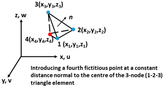 For the in-plane deformation estimation for the floating cover at WTP, finite element formulations can be used. The concept of applying the classic thin shell assumptions to the tetrahedral solid elements [22,23] is proposed to calculate the field scale in-plane deformation. To convert the solid tetrahedral element for the floating cover problem, some shell assumptions have to be made to simplify the calculations, viz. (1) plane stress condition, where (2) the element is not stretched in the thickness direction, where (3) plane sections remain plane, (4) discrete Kirchhoff approach where the thickness is assumed to be normal to the surface (, ) and (5) introducing a fourth fictitious node situated at the centre of the triangle and with a constant distance normal to the surface of the triangle element. Figure 4 shows the proposed element in 3D coordinates with points 1–3 (3 node triangle element) on the surface of the floating cover and point 4 as an imaginary point with a distance away normal to the centroid of the triangle formed by points 1–3. The nominal thickness of the cover is set to be 2 mm from the upper surface of the floating cover. The membrane behaviour of the element is derived from the solid volume tetrahedron element [24]. After applying the assumptions, the strain tensor of the tetrahedral element can be reduced and rewritten as Equation (1).