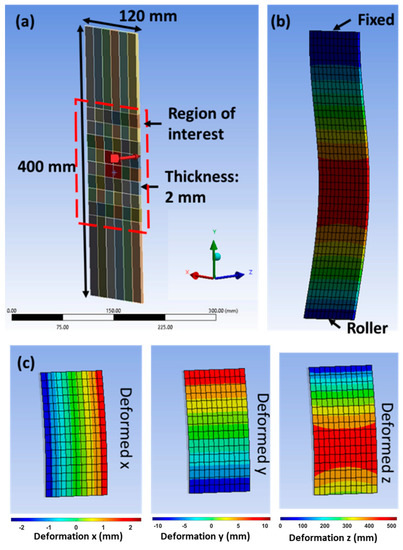 To verify the proposed analysis technique, a model of a piece of rectangular thin HDPE membrane (400 mm × 120 mm × 10 mm) was constructed using ANSYS 19.2, see Figure 5a. The Young’s modulus of the HDPE is 1.1 GPa and its Poisson’s ratio of 0.418 was used. A 10 mm mesh size was used to construct 480 hexahedron elements for the membrane. Assuming the HDPE remains within the elastic range, a point load of 250 N was applied at the centre (20 mm × 20 mm) of the membrane with one end of the membrane set up with fixed and the other end set as a roller (no displacement in z) indicated in Figure 5b. The directional deformation and strain (in terms of x, y and z) of the membrane were then calculated, see Figure 5c.