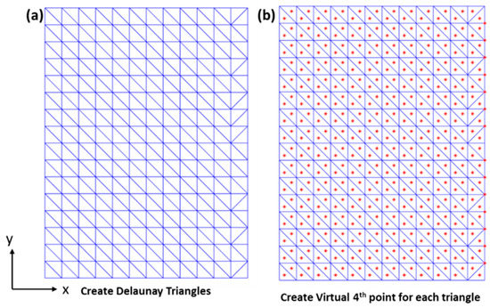 (a) Triangular mesh generated using Delaunay Triangular given the coordinates within the region of interest; (b) calculating the centroid of the generated triangle as the fourth virtual point for each triangle mesh.