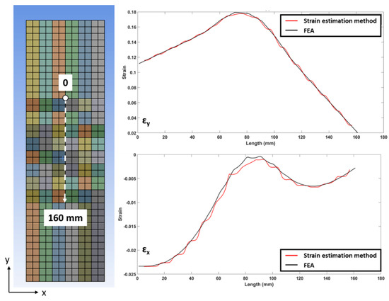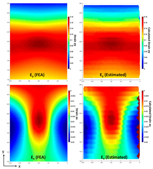 Strain contour plots along x and y for FEA and estimated using the proposed technique.