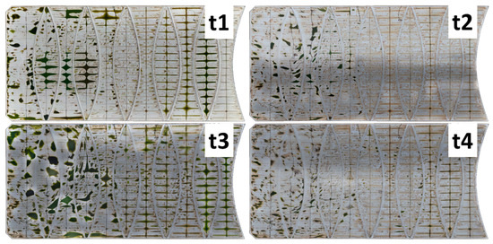 Figure 9 shows four sets of orthophoto and DEM obtained using UAV photogrammetry as described in Section 2 and [16,17], which are imported to MATLAB 2019a for processing. The approximate time frames of these aerial scans were conducted in (1) t1 = 2 years, (2) t2 = 5 years, (3) t3 = 5.5 years and (4) t4 = 6 years after the installation of the floating cover at WTP. The DEMs of all the scans from one of the covers are presented in Figure 10. The difference in elevation (out-of-plane deformation) can be observed over time from t1 to t4. However, the deformation of the floating cover is not only restricted to the elevation (z-direction), but also the in-plane direction (x and y-directions). Out-of-plane and in-plane deformation of the floating covers are important as both information will provide a more complete state of deformation of the floating cover.