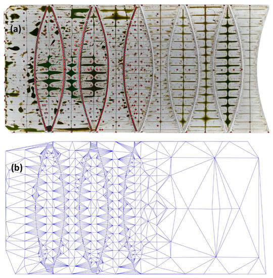 (a) Distinguishable features on the floating cover; (b) triangular mesh of the distinguishable features using Delaunay Triangulation algorithm in MATLAB.