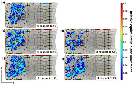 Relative equivalent in-plane movement for (a) t2 with respect to t1, (b) t3 with respect to t1, (c) t4 with respect to t1, (d) t3 with respect to t2 and (e) t4 with respect to t3.