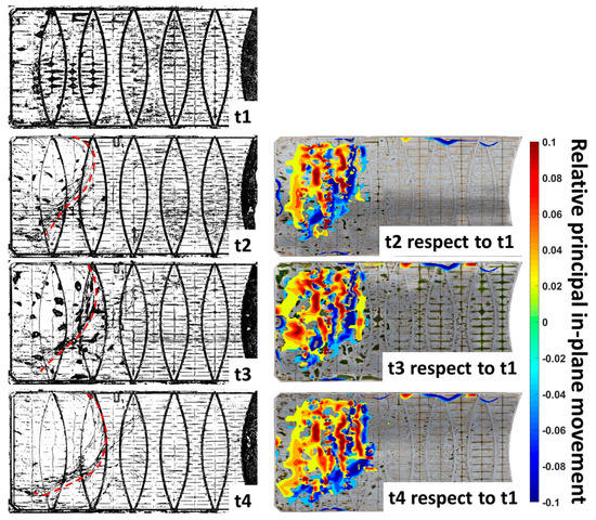 (left column) Wrinkles profile (wavefront—red) of floating cover from t1–t4; (right column) Principal in-plane movement of floating cover with respect to t1.