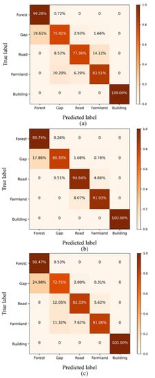 In order to intuitively evaluate the recognition results of various geo-objects, the normalized confusion matrices of study area II are listed in Figure 7. As shown in the figure, using different classifiers, the change in forest recognition accuracy was the smallest, and the recognition accuracy of buildings reached 100%. Additionally, due to the complexity of geo-objects, the extraction accuracy of canopy gaps was lower than that of study area I, and the main error came from the farmlands. However, the RF classifier still achieved the highest classification accuracy. Compared with the traditional object-oriented classification method, the final accuracies were improved by adding edge information. In the RF classification, the accuracy of the canopy gap increased by 7.55%, which indicates that the proposed method can improve the segmentation quality and classification accuracy.