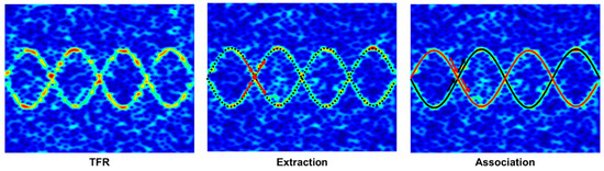 To deal with the overlapping m-Ds, the TFR-based m-D estimation often contains two processes: extraction of the pixels that belong to the m-D components, and the association of these pixels with the corresponding scattering centers, as shown in Figure 3. The extraction stage can be peak detection or ridge extraction, while the association is achieved by first finding the continuous parts of the m-Ds and then by connecting the parts before and after intersection points with special features such as slope.