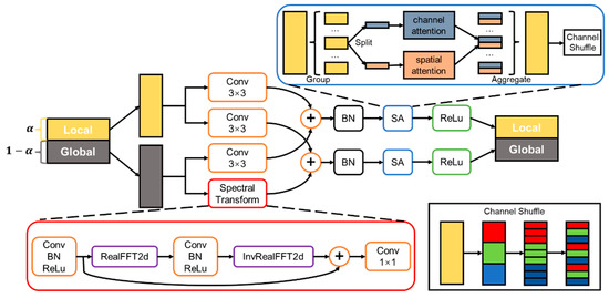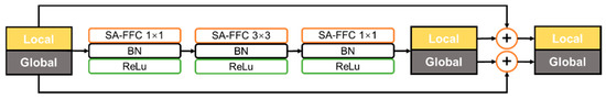 The SA-FFC can be used as a substitute for regular convolution. In this paper, ResNet was used as the backbone, and the SA-FFC-ResNet could therefore be obtained; the basic block of FFC-SA ResNet is shown in Figure 7. Assuming the input image size is I, the size of output feature maps of FFC-ResNet are , , , , respectively.