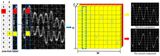 where function consists of extraction part and association part . The can be regarded as a map process that converts an -dimensional vector into a -dimensional vector, which corresponding the frequency dimension coordinate of components. The task of is to find the pixels that belong to the m-D components. One can use features such as shape, color and amplitude to achieve this. This task can be transformed to a classification problem and neural network-based segmentation [23] or anchor-based semantic line detection methods [20,24] as shown in Figure 4. It was proved in [20] that the anchor-based line detection method has better performance and higher computing efficiency. In view of this, we used this type of method on TFR m-D extraction. At each time instant , the proposed method outputs frequency coordinates by using a multilabel classification function, which can be expressed as