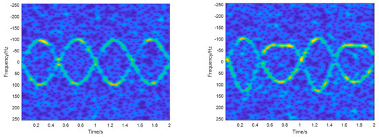 The micro-motion signal can be transformed from the time domain to the time–frequency domain for joint characterization through TFR. As shown in Figure 2, in the TF plane, the energy of the signal concentrates around the signal’s IFs (m-Ds), which looks like multiple ridges (curves), while the noise distributes over the entire plane [22].