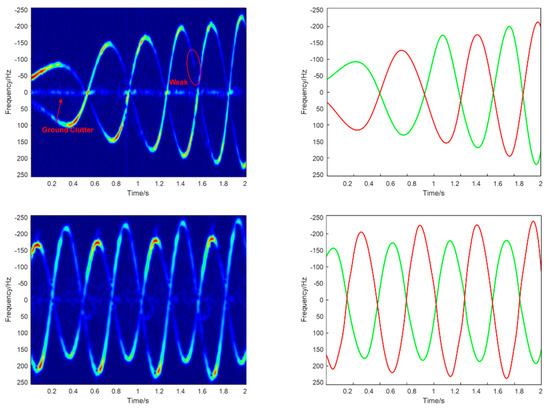 The image-based methods are based on time–frequency representation (TFR). As TFR can characterize the echo signal in time and frequency dimensions, it is widely used for m-D feature extraction. The m-D signal presents multiple continuous ridges in the TFR. Thus, the m-D can be estimated by applying curve detection methods. Hough transform (HT) [9] and inverse radon transform (IRT) [10] extract m-D components by carrying out a peak selecting procedure in transform space. These two methods work well in extracting cross components even if strong noise exists, but the m-D model needs to be preset, which has limitations in real-world scenarios, where the m-D model is unknown as a prior or if there is a derivation between the real m-D and its model. The Viterbi algorithm (VA) and its improved version [11] perform m-D component extraction by detecting curves on the TFR by setting the path connection penalty function. However, VA-based methods are computationally expensive. Ridge detection and tracking methods are computationally efficient alternatives to the VA. The ridge path regrouping algorithm (RPRG) detects and regroups components based on the slope of IF at the intersection region [12], but it is sensitive to noise. The adaptive directional time–frequency distribution-based ridge tracking (ADTFD-RT) method estimates the IF of components along the direction of the principal axis of ridges [13], yet the improved performance is achieved at the expense of additional calculation costs.