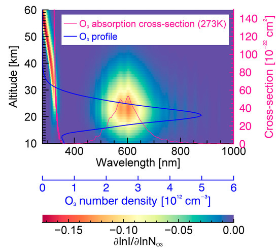 The peak sensitivity of the LSR I from 280 to 1000 nm to the ozone number density at different altitudes calculated by SCIATRAN under a given viewing condition (solar zenith angle of 45°; relative azimuth angle of 45°, i.e., the angle of the LOS relative to the sun). The blue solid line is the corresponding ozone profile. The deep pink solid line is the absorption cross-section of ozone at 273 K.