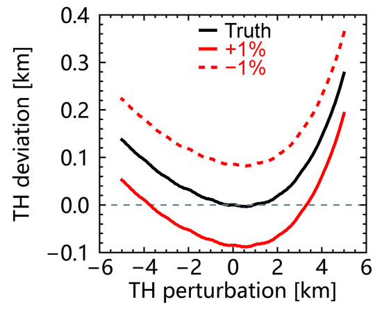 Sensitivity of the TH correction values obtained by the ARRM to the LSR at 295 nm. The black solid line represents the deviations of the TH that still exist after the ARRM registration when different perturbations are artificially added to the TH. The red solid and dashed lines are the TH deviation curves after artificially increasing and decreasing the LSR at 295 nm by 1%, respectively.