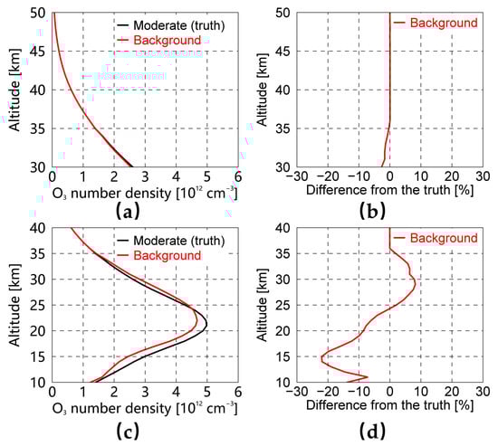 (a,c) are the upper and lower ozone profiles retrieved under different loading of stratospheric aerosols, respectively. The black and red solid lines represent moderate volcanic and background conditions, respectively. (b,d) are the differences between the ozone profiles retrieved under background and moderate volcanic conditions in (a,c), respectively.