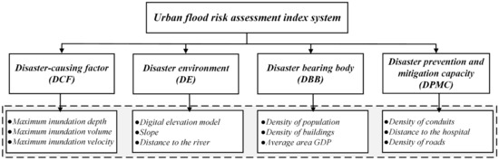 The commonly used urban flood risk assessment indices (DCF, DE, DBB, and DPMC) were used for reference to establish the assessment system according to the previous literature [29,42,43].