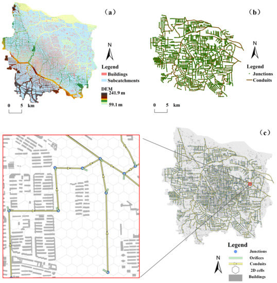 (a) Distribution of sub-catchments and buildings; (b) distribution of junctions and conduits; (c) link of one-dimensional conduit model and two-dimensional floodplain model.