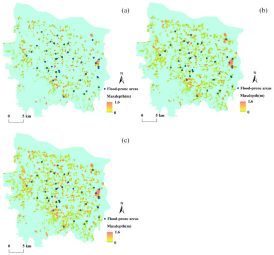 The simulation results were compared with the flood-prone areas in Zhengzhou and the results are shown in Figure 5 and Table 2. Considering the actual situation, the area with the inundation depth greater than 10 cm was considered to have the greatest impact on people’s daily life. The results with a return period of 10 years showed that 33 of 39 flood-prone areas generated waterlogging (Figure 5a). There were 40 flood-prone areas that generated waterlogging with a return period of 50 years, 35 of which were over 10 cm (Figure 5b). Forty-one flood-prone areas with a return period of 100 years generated waterlogging, 38 of which were over 10 cm (Figure 5c). It can be seen from Table 2 that in the three designed rainfall events, the proportion of flood disasters that occurred in flood-prone areas was 78.5%, 83.3%, and 90.5%, respectively, each of which was greater than 75%. Therefore, the model was considered to have high simulation accuracy.