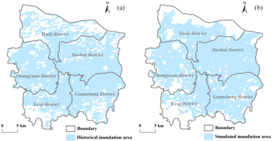 The calibration of urban hydrodynamic model was applied to the flood-prone areas and the inundation of historical rainfall events. First, the inundation distributions of different return period rainfall events were compared with the flood-prone areas in Zhengzhou, which were provided by the Zhengzhou Municipal Administration Bureau. Second, the inundation depths of observation points were compared with simulated values by the PCSWMM during historical rainfall events. Third, we compared the simulated inundation area with that of an area obtained by remote sensing data in the rainfall event that occurred on 20 July 2021, and the remote sensing data has been reported by Reference [49].