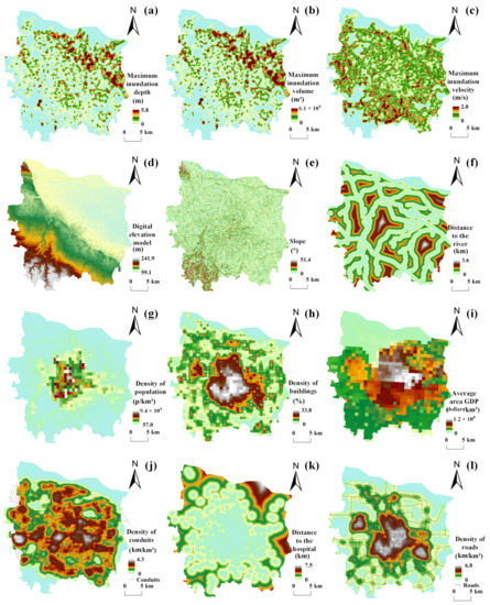 The spatial distributions of the DEM, SL, DRI, DP, DB, AGDP, DC, DRO, and DH indices were obtained by ArcGIS software (see Section 2.2). MD, MVO, and MVE were obtained from the urban flood inundation model, which was introduced as set out below.