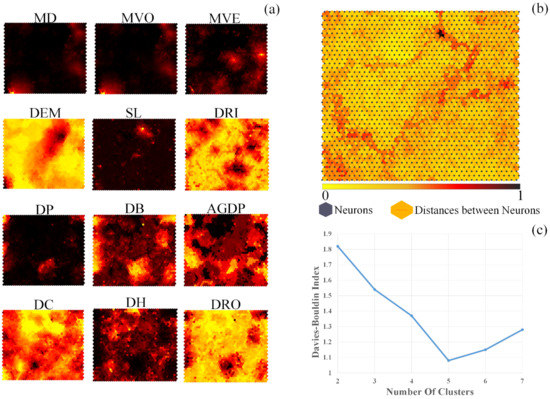 A 40 × 40 SOM neural network was established, according to Equation (17) in Section 3.5. The input planes (Figure 8a) and the weight distance matrix (Figure 8b) were visualized, according to the established SOM neural network. The input planes showed the correlation of different indices. The more similar the connection pattern of the inputs, the more relevant the inputs were. For example, MD and MVO were highly related, due to their inputs (Figure 8a). The weight distance matrix showed the distance of different neurons (Figure 8b). The small hexagon represents neurons, while the large hexagon visualizes the distance between neurons. The darker the color of the large hexagon, the farther the distance. A total of 100,528 grids were stored in different neurons and were classified based on the distance between the neurons. The DBI of different clustering numbers was determined by Equation (18). As shown in Figure 8c, when the clustering number corresponded to 5, the DBI value was the smallest. Therefore, the optimal effect was achieved when the number of clusters was five. The urban flood risk was classified into five corresponding levels from high to low: highest risk, higher risk, medium risk, lower risk, and the lowest risk.