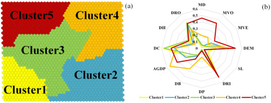 Figure 9a shows the classification of neurons. The radar diagram of the average values of different cluster indices (after standardization) is shown in Figure 9b. Cluster 5 had the highest disaster-causing factor index value, especially for MD and MVO, which were much higher than other clusters. DEM and DRI (after standardization) were also the largest among the disaster environment. The cluster was considered to be extremely vulnerable to flooding, so cluster 5 was the highest risk area. Cluster 4 had the largest disaster-bearing body index, and its DP, DB, and AGDP were higher than those of other clusters. MD and MVO were second only to cluster 5, so cluster 4 was considered as the higher risk area. The index values of cluster 1 were all relatively small; DEM, MD, and MVO were the smallest and were the least prone to flood disasters. Therefore, cluster 1 belonged to the lowest risk area. Cluster 2 had dense conduits and larger DEM, but the largest MVE; other indices were greater than those of cluster 1, so cluster 2 was classified as the lower risk area. Cluster 3 had the smallest DRI, a smaller DC, and a lower DEM than those of clusters 1 and 2, so cluster 3 belonged to the medium risk area.