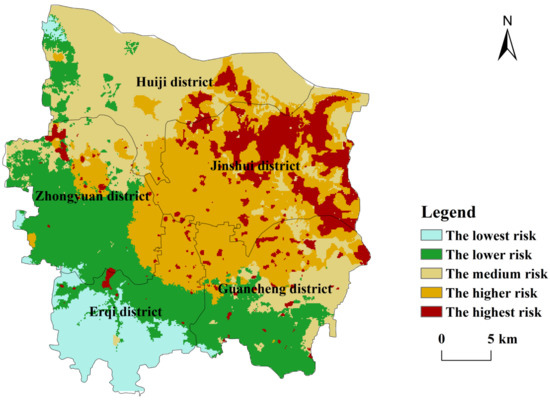 The flood risk distribution in Zhengzhou showed that the flood risk was classified into five corresponding levels from high to low: highest risk, higher risk, medium risk, lower risk, and the lowest risk. The highest risk areas were mainly distributed in the central and eastern parts of the Jinshui District, the eastern part of the Huiji District, and the northeastern part of the Guancheng District, accounting for 9.86% of the total area. The higher risk areas accounted for 24.26% of the total area and were mainly located in the western and southern parts of the Jinshui District, the southern part of the Huiji District, the middle and eastern parts of the Zhongyuan District, the northeastern part of the Erqi District, and the northwestern part of the Guancheng District. As a comparison, the other three approaches (the AHP-SOM method, the D-AHP and natural-break method, and the TOPSIS-with-entropy-weighting method) were also considered for urban flood risk assessment. The results demonstrated that the integrated approach of the D-AHP method and the SOM clustering algorithm is more reasonable and scientific.
