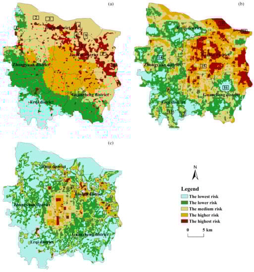 Spatial distribution map of flood risk in Zhengzhou: (a) based on the AHP-SOM method; (b) based on the D-AHP and natural-breaks method; and (c) based on the TOPSIS-with-entropy-weighting method. Areas 1–16 in sub-figures (a) and (b) were selected to compare the results of different risk assessment methods.